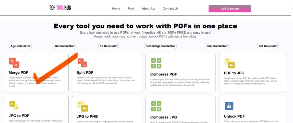 pdftoolhub.in par jaaiye aur “Merge PDF” tool par click karein.